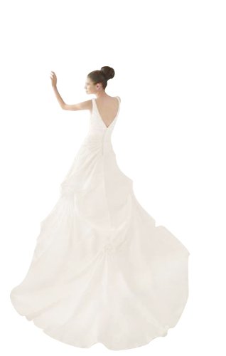 Wedding Dress Silhouette: A-Line/Princess Neckline: V-neck Hemline/Train: Court Train Sleeve Style: Sleeveless Embellishment: Draped Back Details: Covered Button Fully lined: Yes Built-In Bra: Yes Fabric: Taffeta Shown Color: Ivory Wedding Venues: Church/Hall/Garden/Outdoor Season: Spring/Summer/Fall/Winter