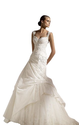 Wedding Dress Silhouette: A-Line/Princess Neckline: Sweetheart Hemline/Train: Court Train Sleeve Style: Regular Straps Embellishment: Draped/Applique Back Details: Covered Button Fully lined: Yes Built-In Bra: Yes Fabric: Taffeta Shown Color: Ivory Wedding Venues: Church/Hall Season: Spring/Summer/Fall/Winter