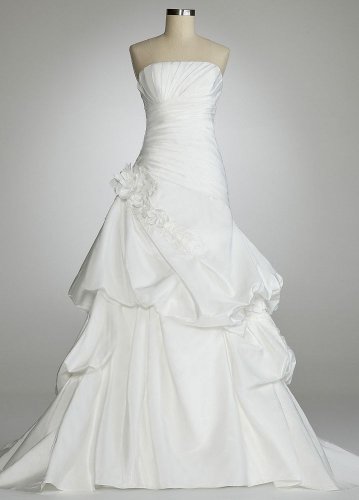 The Detailed Description of David's Bridal Wedding Dress: Strapless Pleated Bodice Gown with Pick Up Skirt Style 120472, Soft White, 8