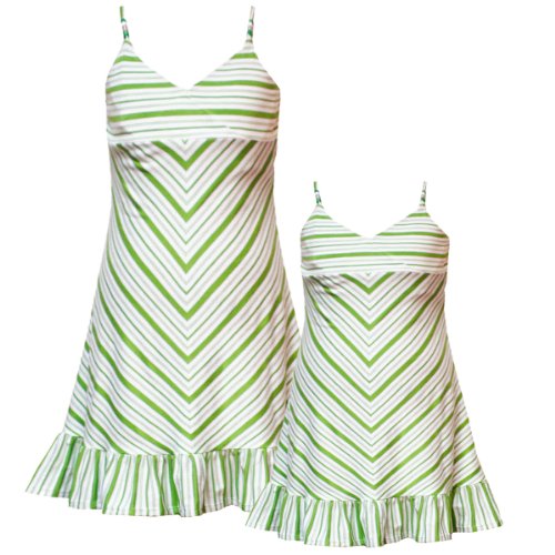 Beautiful LIME-GREEN & WHITE STRIPED KNIT DRESS features sleeveless FAUX-WRAP BODICE with V-neckline and NOVELTY BEADED ACCENT at the shoulder straps. At/Below knee-length skirt features LIME-GREEN & WHITE CHEVRON STRIPES with RUFFLED HEM. Machine washable. Imported. Of acrylic/polyester/spandex - Lining of polyester - Exclusive of trim/decoration. Matching/Coordinating sister styles available in sizes 2T-16, search for style(s): RRE-31040. More girl party dresses available, search for: " rre-girl-party-dress "