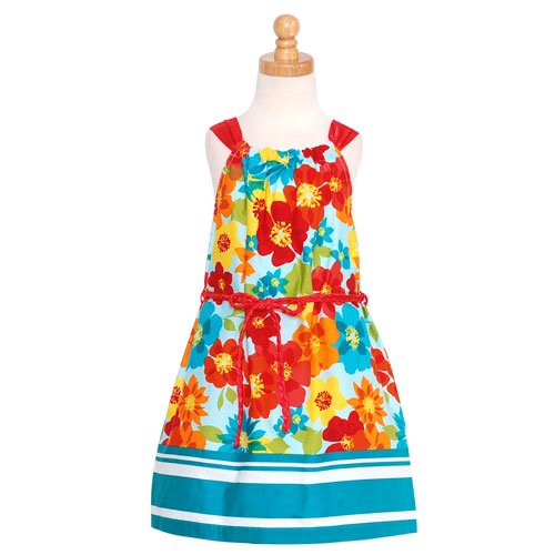 This Bonnie Jean dress is sure to be a success for your little girl. This strappy dress is gathered at the neckline and is made of a vibrant floral material. Comes with a braided, red, satin, removable belt. A great dress to celebrate summer.