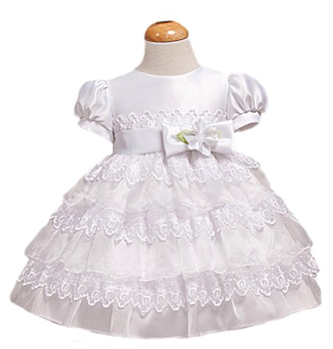 New Awe-Inspiring Ruffled Baby Dress; Poufy Short Sleeved Bodice with Appliqud Lace Accents and Large Bow; Alternating Tiers of Appliqud Lace and Organza Ruffles; Zippered Closure & Tie Sash for a Customized Fit at the Waist; 70% Polyester 30% Acetate; Hand Wash; Made in USA