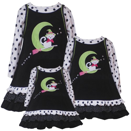 - BLACK CORDUROY JUMPER DRESS features Halloween-Theme applique of GREEN-CRESCENT-MOON and WHITE CAT-ON-BROOMSTICK with SPARKLING RHINESTONE ACCENTS and TRIPLE TIERED RUFFLE HEM plus easy back zip closure.