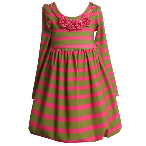The Detailed Description of Size-6 BNJ-2131-B GREEN FUCHSIA-PINK PULL-THRU ROSETTE NECKLINE STRIPED KNIT BUBBLE Special Occasion Girl Party Dress,B32131 Bonnie Jean LITTLE GIRLSFeatures