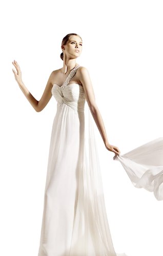 Wedding Dress Silhouette: A-Line/Princess Neckline: One-Shoulder Hemline/Train: Watteau Train Sleeve Style: Sleeveless Embellishment: Draped Back Details: Zipper-up Fully lined: Yes Built-In Bra: Yes Fabric: Chiffon Shown Color: Ivory Wedding Venues: Church/Hall Season: Spring/Summer/Fall/Winter