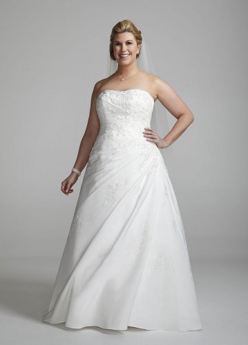 The Detailed Description of David's Bridal Wedding Dress: Sweetheart Strapless Fallie A Line with Appliques Style 9N9829, Ivory, 18W