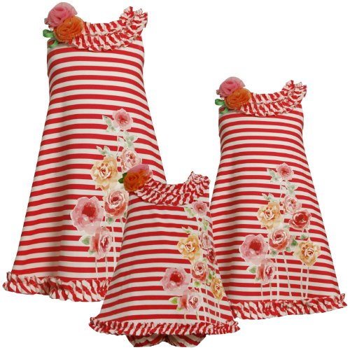 Beautiful CORAL & WHITE STRIPED A-LINE SLEEVELESS KNIT DRESS features ROSE FLORAL SCREEN PRINT ACCENTED WITH SPARKLING SEQUIN DETAILS and DOUBLE RUFFLE TRIM at the hem & round neckline plus BUTTON-CENTER FLOWER APPLIQUE. Machine washable. Imported. Of cotton/spandex - Exclusive of trim/decoration. Matching/Coordinating sister styles available in sizes 12M-6X, search for style(s): BNJ-3200. More baby & girl party dresses available, search for: "bnj-girl-party-dress "
