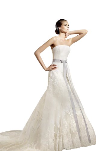 Wedding Dress Silhouette: A-Line/Princess Neckline: Strapless Hemline/Train: Cathedral Train Sleeve Style: Strapless Embellishment: Lace/Sash Back Details: Covered Button Fully lined: Yes Built-In Bra: Yes Fabric: Lace Shown Color: Ivory Wedding Venues: Church/Hall Season: Spring/Summer/Fall/Winter